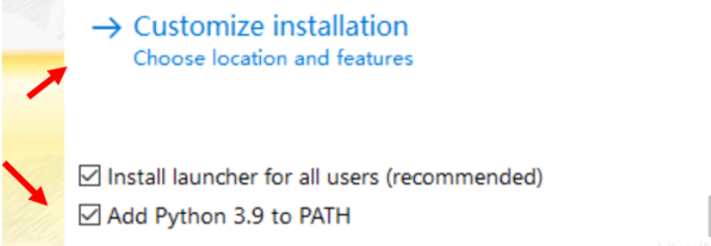 3. 双击下载的安装包 python-3.9.5.exe,出现如下界面,请务必选中复选框:Add Python 3.9 to PATH这个框,点击 Customize installation进入一步,以方便我们自定义安装路径)