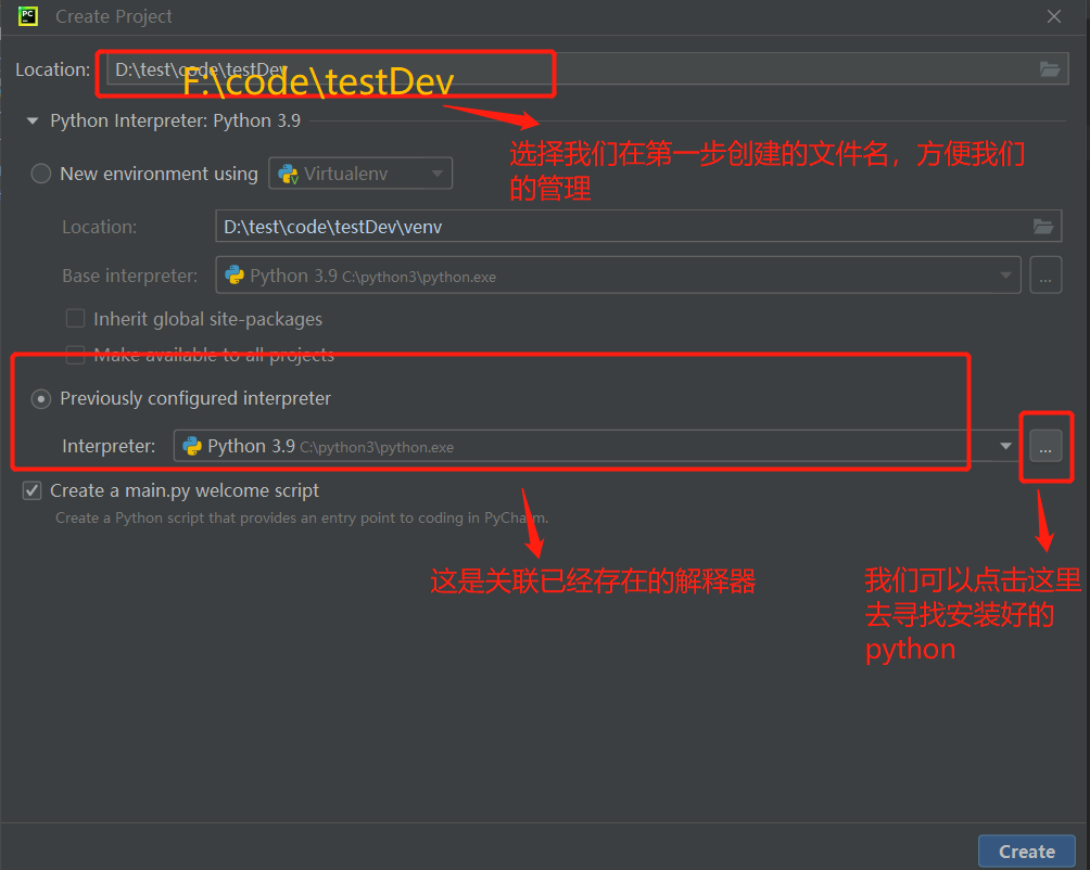 4.创建一个新的Python项目,选择非虚拟环境,路径是自己设置的如下图所示