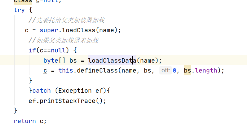 import java.io.ByteArrayOutputStream; import java.io.FileInputStream; /** * 自定义类加载器移除先委托父类加载类的功能 */ public class MyClassLoader extends ClassLoader{ //class文件的根路径 String parent="D:\idea11\untitled\类的加载机制和反射机制"; //加载Class对象的方法 public Class<?> findClass(String name){ Class c=null; try { //先委托给父类加载器加载 c = super.loadClass(name); //如果父类加载器未加载 if(c==null) { byte[] bs = loadClassData(name); c = this.defineClass(name, bs, 0, bs.length); } }catch (Exception ef){ ef.printStackTrace(); } return c; } //根据类名来从class文件中读取字节数据 //com.newer.test.Student private byte[] loadClassData(String name){ //将类类路径解析为文件路径 name = name.replace(".","\\"); name = name+".class"; String path = parent+"\\"+name; try { //建立文件字节输入流 FileInputStream fis = new FileInputStream(path); //创建一个字节数组输出流来缓存读入的数据 ByteArrayOutputStream bos = new ByteArrayOutputStream(); int t = fis.read(); while(t!=-1){ bos.write(t); t = fis.read(); } //将字节数组输出流转换成字节数组 byte[] bs = bos.toByteArray(); fis.close(); bos.close(); return bs; }catch (Exception ef){ ef.printStackTrace(); } return null; } }