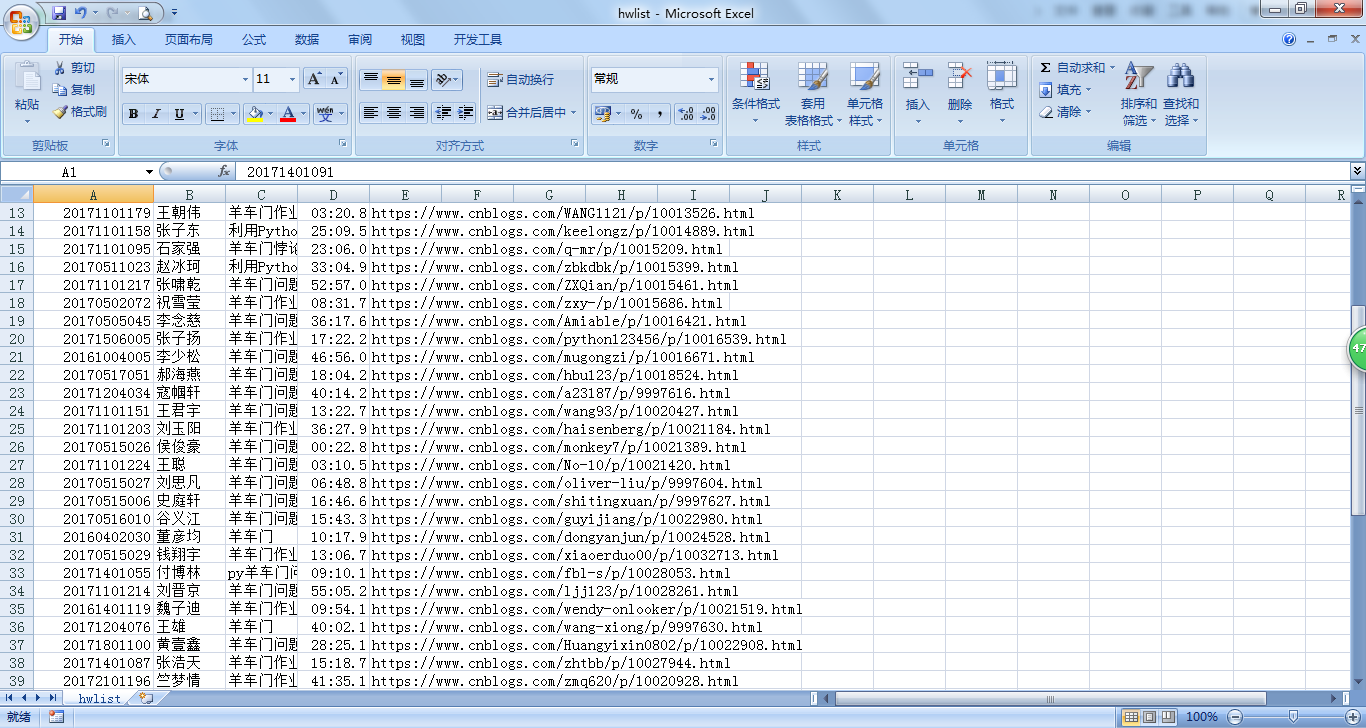 import requests import json r=requests.get("https://edu.cnblogs.com/Homework/GetAnswers?homeworkId=2420&_=1543752749008") if r.status_code==200: pass else: print('false') r.encoding='utf-8' json_data=json.loads(r.text) result='' for i in json_data['data']: u=str(i['StudentNo'])+','+str(i['RealName'])+','+str(i['Title'])+','+str(i['DateAdded'].replace('T',' '))+','+str(i['Url']) result=result+u+'\n' print(u) f=open('hwlist.csv','w') f.write(result) f.close()
