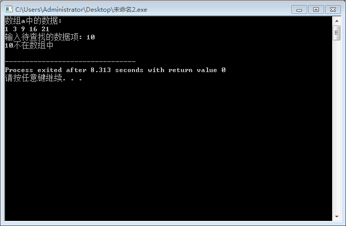 #include <stdio.h> const int N=5; int binarySearch(int x[], int n, int item); int main() { int a[N]={1,3,9,16,21}; int i,index, key; printf("数组a中的数据:\n"); for(i=0;i<N;i++) printf("%d ",a[i]); printf("\n"); printf("输入待查找的数据项: "); scanf("%d", &key); index=binarySearch(a,N,key); if(index>=0) printf("%d在数组中,下标为%d\n", key, index); else printf("%d不在数组中\n", key); return 0; } //函数功能描述: //使用二分查找算法在数组x中查找特定值item,数组x大小为n // 如果找到,返回其下标 // 如果没找到,返回-1 int binarySearch(int x[], int n, int item) { int low, high, mid; low = 0; high = n-1; while(low <= high) { mid = (low+high)/2; if (item == x[mid]) return mid; else if(item<x[mid]) high = mid - 1; else low = mid + 1; } return -1; }