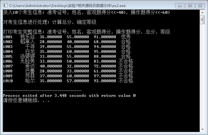{ STU stu[N]; printf("录入%d个考生信息: 准考证号,姓名,客观题得分(<=40),操作题得分(<=60)\n", N); input(stu, N); printf("\n对考生信息进行处理: 计算总分,确定等级\n"); process(stu, N); printf("\n打印考生完整信息: 准考证号,姓名,客观题得分,操作题得分,总分,等级\n"); output(stu, N); return 0; } // 从文本文件examinee.txt读入考生信息:准考证号,姓名,客观题得分,操作题得分 void input(STU s[], int n) { int i; FILE *fp; fp=fopen("examinee.txt","r") ;//以只读文本方式打开文件examinee.txt if( !fp ) { printf("fail to open examinee.txt\n"); // 如果打开失败,则输出错误提示信息,然后退出程序 } for(i=0;i<N;i++) { fscanf(fp,"%ld %s %f %f",&s[i].id,s[i].name,&s[i].objective,&s[i].subjective); } fclose(fp); } // 输出考生完整信息: 准考证号,姓名,客观题得分,操作题得分,总分,等级 // 不仅输出到屏幕上,还写到文本文件result.txt中 void output(STU s[], int n) { int i; FILE *fp; fp=fopen("result.txt","w"); for(i=0;i<N;i++) { fprintf(fp,"%ld %8s %10lf %10lf %10lf %5s\n",s[i].id,s[i].name,s[i].objective,s[i].subjective,s[i].sum,s[i].level); printf("%ld %8s %10lf %10lf %10lf %5s\n",s[i].id,s[i].name,s[i].objective,s[i].subjective,s[i].sum,s[i].level); } fclose(fp); } // 对考生信息进行处理:计算总分,排序,确定等级 void process(STU s[], int n) { int i,j; STU temp; for(i=0;i<N;i++) { s[i].sum=s[i].subjective+s[i].objective; } for(i=0;i<N-1;i++) { for(j=0;j<N-i-1;i++) { if(s[j+1].sum>s[j].sum) { temp=s[j]; s[j]=s[j+1]; s[j+1]=temp; } } } for(i=0;i<N;i++) { if((i+1)<=0.1*N) strcpy(s[i].level,"优秀"); if((i+1)>0.1*N&&(i+1)<=0.5*N) strcpy(s[i].level,"合格"); if((i+1)>0.5*N) strcpy(s[i].level,"不合格"); } }