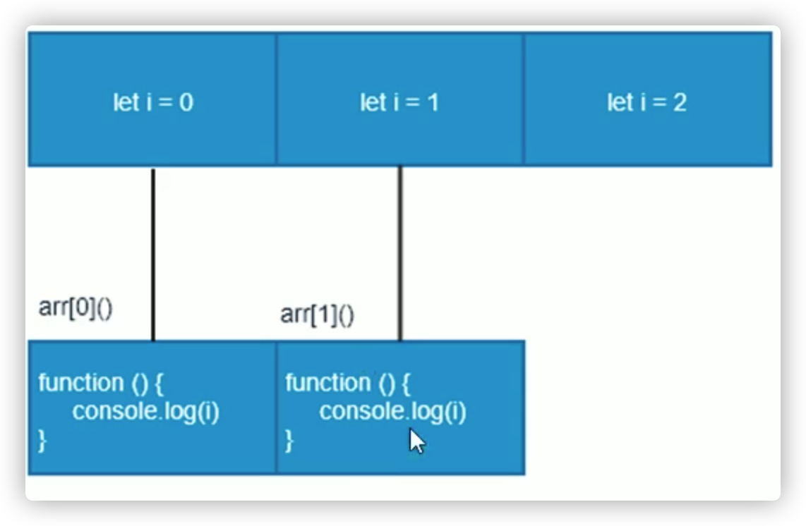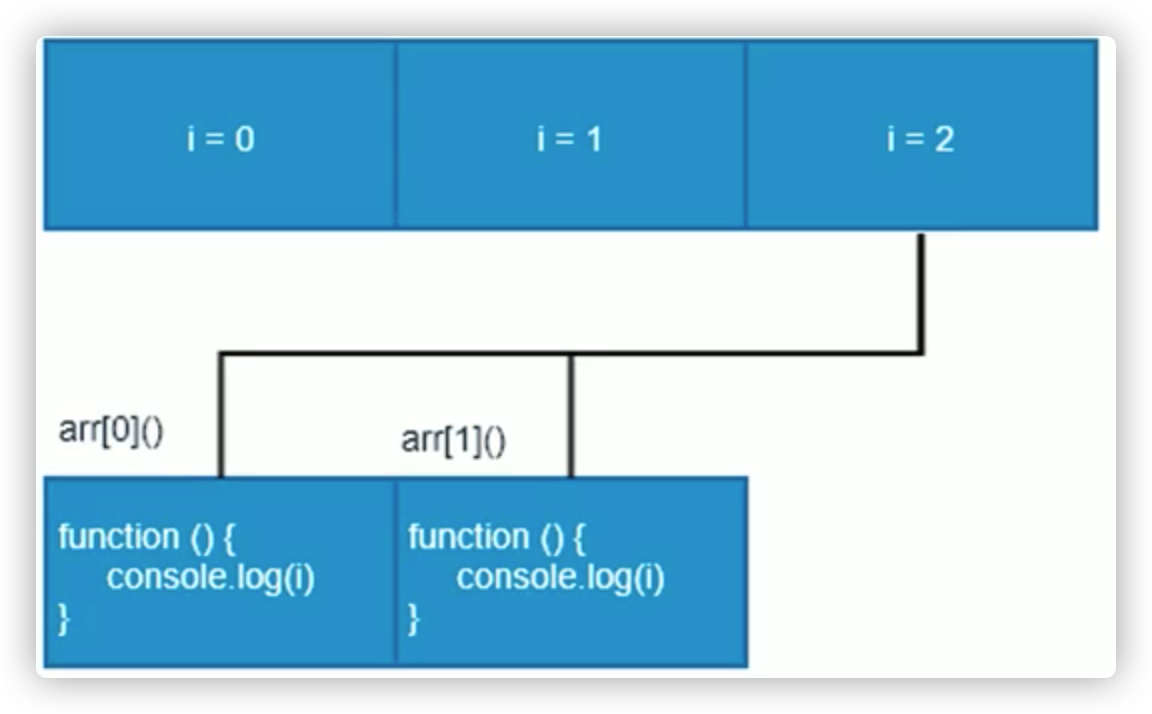 var arr = []; for(var i = 0; i < 2; i++){ arr[i] = function(){ console.log(i); } } arr[0](); arr[1]();