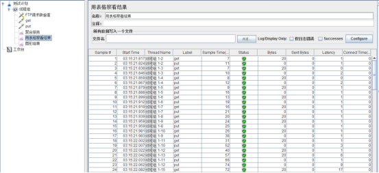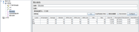 put:完成了30个sample,平均响应时间为31ms,响应时间的中值为20ms,所有sample中90%的sample的响应时间都小于64ms,最小响应时间为12ms,最大响应时间为92ms,错误率为3.33%。