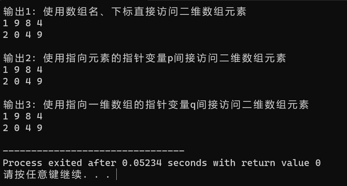 1 #include <stdio.h> 2 3 int main() { 4 int x[2][4] = {{1, 9, 8, 4}, {2, 0, 4, 9}}; 5 int i, j; 6 int *ptr1; 7 int(*ptr2)[4]; 8 9 printf("输出1: 使用数组名、下标直接访问二维数组元素\n"); 10 for (i = 0; i < 2; ++i) { 11 for (j = 0; j < 4; ++j) 12 printf("%d ", x[i][j]); 13 printf("\n"); 14 } 15 16 printf("\n输出2: 使用指向元素的指针变量p间接访问二维数组元素\n"); 17 for (ptr1 = &x[0][0], i = 0; ptr1 < &x[0][0] + 8; ++ptr1, ++i) { 18 printf("%d ", *ptr1); 19 20 if ((i + 1) % 4 == 0) 21 printf("\n"); 22 } 23 24 printf("\n输出3: 使用指向一维数组的指针变量q间接访问二维数组元素\n"); 25 for (ptr2 = x; ptr2 < x + 2; ++ptr2) { 26 for (j = 0; j < 4; ++j) 27 printf("%d ", *(*ptr2 + j)); 28 printf("\n"); 29 } 30 31 return 0; 32 }
