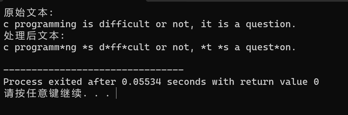 1 #include <stdio.h> 2 #define N 80 3 4 void replace(char *str, char old_char, char new_char); 5 6 int main() { 7 char text[N] = "c programming is difficult or not, it is a question."; 8 9 printf("原始文本: \n"); 10 printf("%s\n", text); 11 12 replace(text, 'i', '*'); 13 14 printf("处理后文本: \n"); 15 printf("%s\n", text); 16 17 return 0; 18 } 19 20 void replace(char *str, char old_char, char new_char) { 21 int i; 22 23 while(*str) { 24 if(*str == old_char) 25 *str = new_char; 26 str++; 27 } 28 }