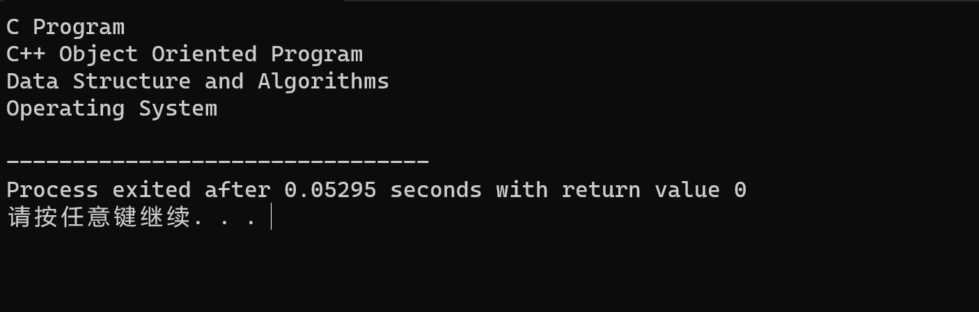 1 #include <stdio.h> 2 #include <string.h> 3 void sort(char *name[], int n); 4 5 int main() { 6 char *course[4] = {"C Program", 7 "C++ Object Oriented Program", 8 "Operating System", 9 "Data Structure and Algorithms"}; 10 int i; 11 12 sort(course, 4); 13 for (i = 0; i < 4; i++) 14 printf("%s\n", course[i]); 15 16 return 0; 17 } 18 19 void sort(char *name[], int n) { 20 int i, j, k; 21 char *tmp; 22 23 for (i = 0; i < n - 1; i++) { 24 k = i; 25 for (j = i + 1; j < n; j++) 26 if (strcmp(name[j], name[k]) < 0) 27 k = j; 28 29 if (k != i) { 30 tmp = name[i]; 31 name[i] = name[k]; 32 name[k] = tmp; 33 } 34 } 35 }