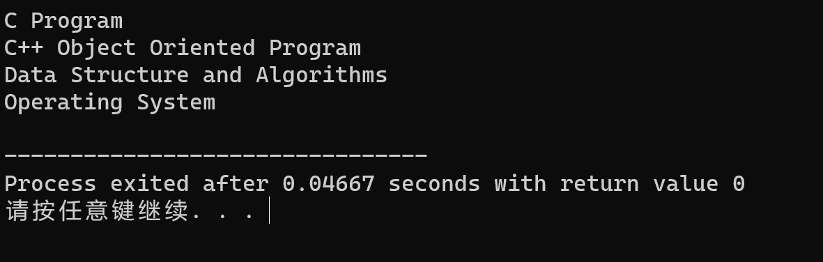 1 #include <stdio.h> 2 #include <string.h> 3 void sort(char *name[], int n); 4 5 int main() { 6 char *course[4] = {"C Program", 7 "C++ Object Oriented Program", 8 "Operating System", 9 "Data Structure and Algorithms"}; 10 int i; 11 12 sort(course, 4); 13 14 for (i = 0; i < 4; i++) 15 printf("%s\n", course[i]); 16 17 return 0; 18 } 19 20 void sort(char *name[], int n) { 21 int i, j; 22 char *tmp; 23 24 for (i = 0; i < n - 1; ++i) 25 for (j = 0; j < n - 1 - i; ++j) 26 if (strcmp(name[j], name[j + 1]) > 0) { 27 tmp = name[j]; 28 name[j] = name[j + 1]; 29 name[j + 1] = tmp; 30 } 31 }