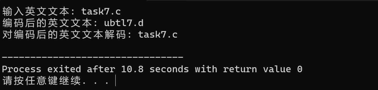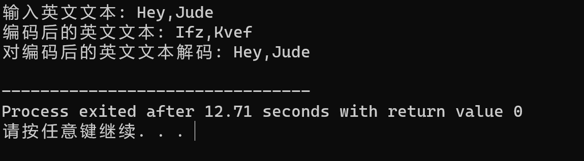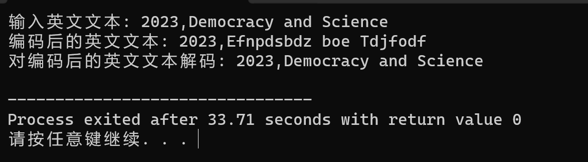 1 #include <stdio.h> 2 #define N 80 3 void encoder(char *str); 4 void decoder(char *str); 5 6 int main() { 7 char words[N]; 8 9 printf("输入英文文本: "); 10 gets(words); 11 12 printf("编码后的英文文本: "); 13 encoder(words); 14 printf("%s\n", words); 15 16 printf("对编码后的英文文本解码: "); 17 decoder(words); 18 printf("%s\n", words); 19 20 return 0; 21 } 22 23 void encoder(char *str) { 24 for (;*str;str++) 25 { 26 if (*str>='A'&&*str<='z') 27 { 28 if (*str=='z') 29 *str='a'; 30 else if (*str=='Z') 31 *str='A'; 32 else 33 *str+=1; 34 } 35 } 36 } 37 38 void decoder(char *str) { 39 for (;*str;str++) 40 { 41 if (*str>='A'&&*str<='z') 42 { 43 if (*str=='a') 44 *str='z'; 45 else if (*str=='A') 46 *str=='Z'; 47 else 48 *str-=1; 49 } 50 } 51 }