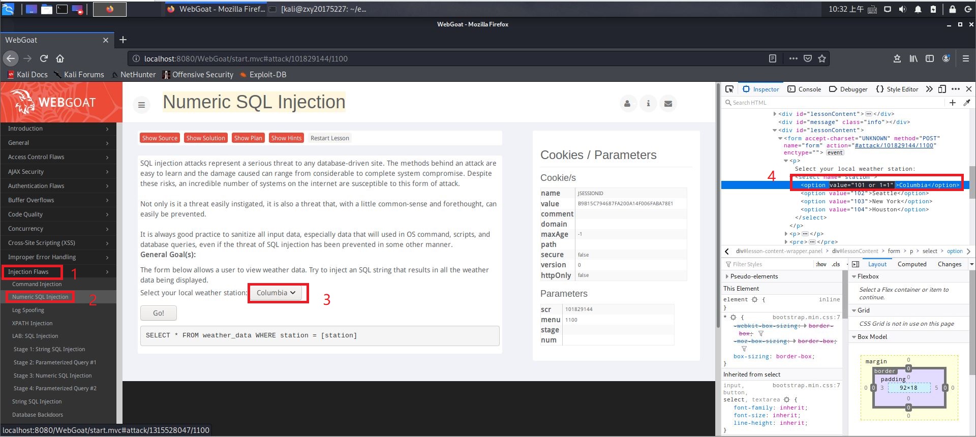 Injection Flaws->Numeric SQL Injection,点击Go!按钮,可查询Columbia的天气情况。 - 现在要设法改变网页源码,使得在Columbia选项下可以查询到源码中所有城市的天气情况。