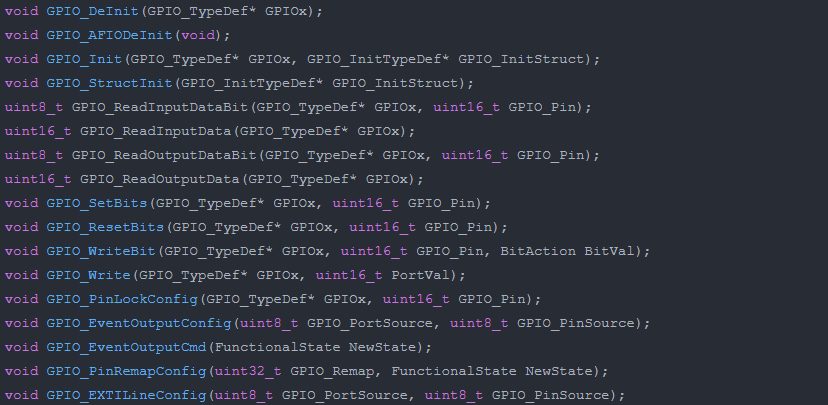 参 数:GPIOx用来选择GPIO外设,取值可为GPIOA-GPIOG;GPIO_InitStructure为GPIO_InitTypedef类型结构体指针,指向包含GPIO外设配置信息的GPIO_InitTypedef结构体。