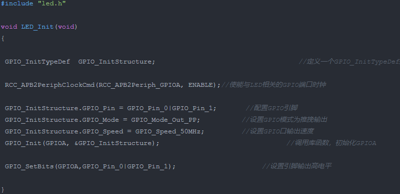 功 能:初始化结构体成员,即用其默认值填充每个GPIO_StructInit成员,包括GPIO_Pin、GPIO_Speed、GPIO_Mode等。