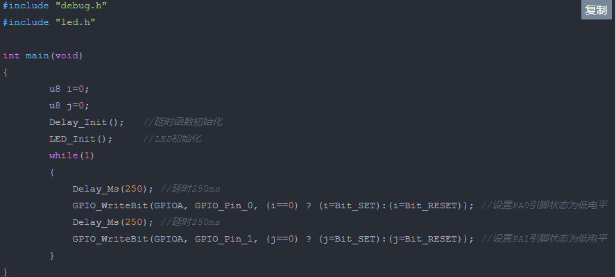 完成led.c和led.h之后,对其进行编译保存,继续对main函数进行编写,main函数具体代码如下: