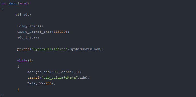 main.c文件主要进行相关函数的初始化以及打印输出通过ADC_IN1读取到的ADC值。