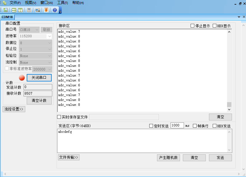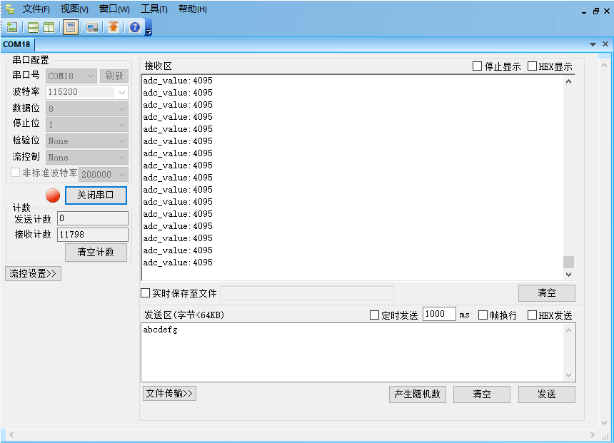 本章教程通过ADC1通道1读取开发板VCC引脚和GND引脚ADC值,并通过串口调试助手打印显示出来。
