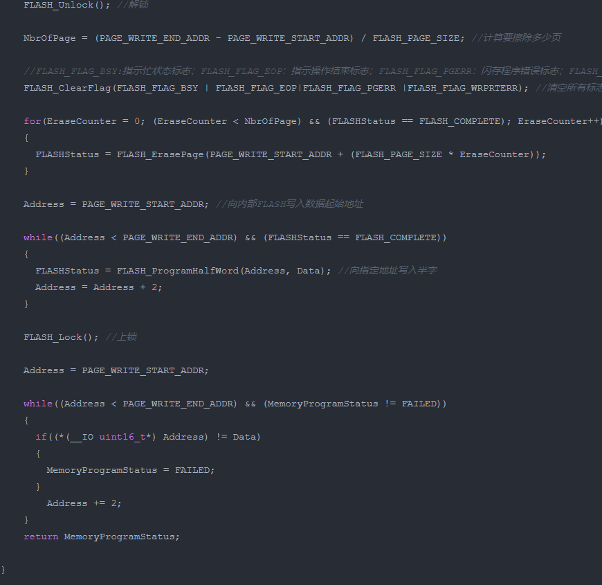 (4) 使用for循环以及调用FLASH_ErasePage函数擦除页数,每次擦除一页;