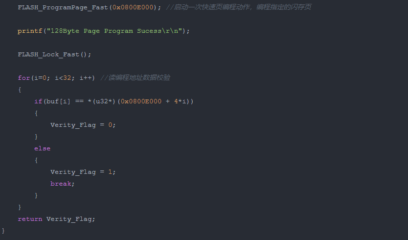 (5) 调用FLASH_ProgramPage_Fast函数启动一次快速页编程动作,编程指定的闪存页;