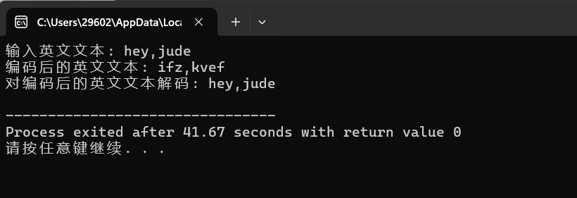 #include <stdio.h> #define N 80 void encoder(char *str); // 函数声明 void decoder(char *str); // 函数声明 int main() { char words[N]; printf("输入英文文本: "); gets(words); printf("编码后的英文文本: "); encoder(words); // 函数调用 printf("%s\n", words); printf("对编码后的英文文本解码: "); decoder(words); // 函数调用 printf("%s\n", words); return 0; } /*函数定义 功能:对s指向的字符串进行编码处理 编码规则: 对于a~z或A~Z之间的字母字符,用其后的字符替换; 其中,z用a替换,Z用A替换 其它非字母字符,保持不变 */ void encoder(char *str) { while(*str){ if(*str=='z'||*str=='Z'){ *str-=32; } if((*str>='a'&&*str<'z')||(*str>='A'&&*str<'Z')){ *str=*str+1; } str++; } } /*函数定义 功能:对s指向的字符串进行解码处理 解码规则: 对于a~z或A~Z之间的字母字符,用其前面的字符替换; 其中,a用z替换,A用Z替换 其它非字母字符,保持不变 */ void decoder(char *str) { while(*str){ if(*str=='a'||*str=='A'){ *str+=32; } if((*str>'a'&&*str<='z')||(*str>'A'&&*str<='Z')){ *str=*str-1; } str++; } }