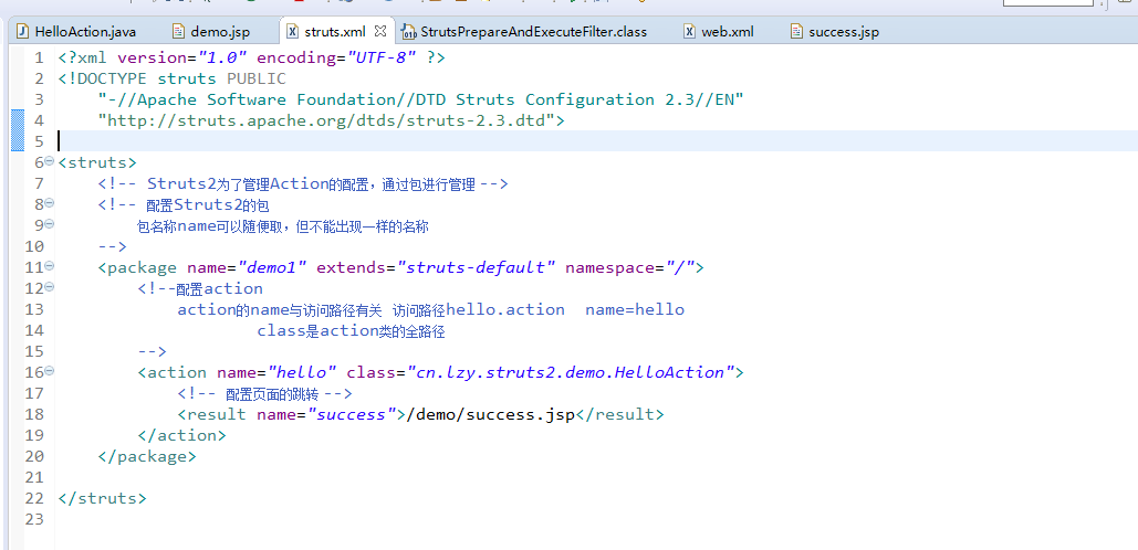 4.新建一个jsp,内容如下,注意是hello.action,要加action后缀,新建一个success.jsp用于跳转,内容随意
