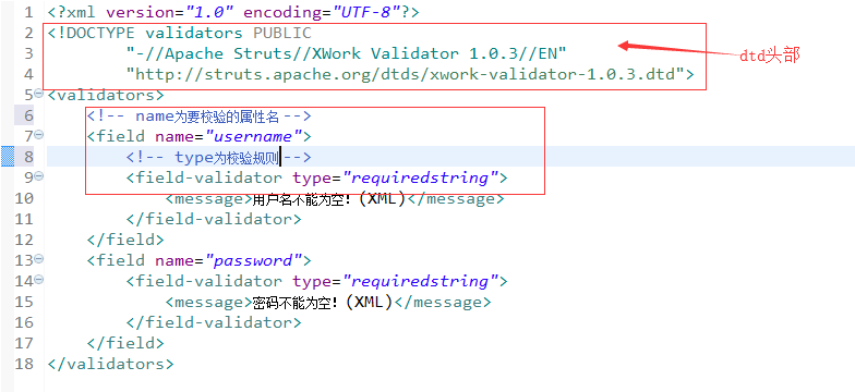 2.在xml文件中引入dtd头部:在xwork-core-2.3.24.jar包中的/xwork-validator-1.0.3.dtd中