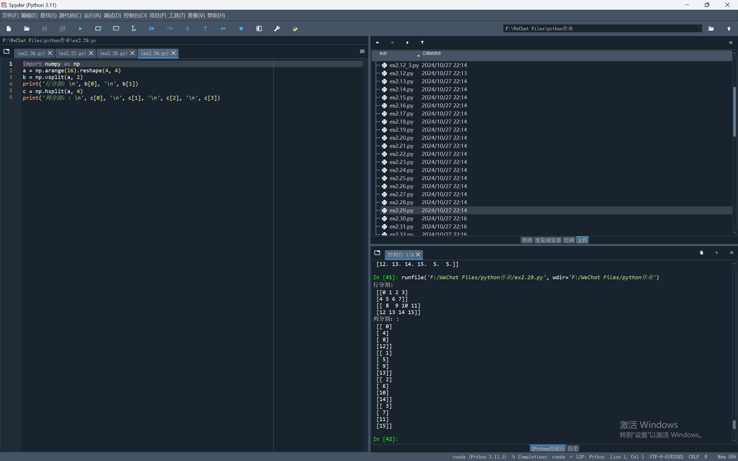 import numpy as np a = np.arange(16).reshape(4, 4) b = np.vsplit(a, 2) print('行分割: \n', b[0], '\n', b[1]) c = np.hsplit(a, 4) print('列分割:: \n', c[0], '\n', c[1], '\n', c[2], '\n', c[3])