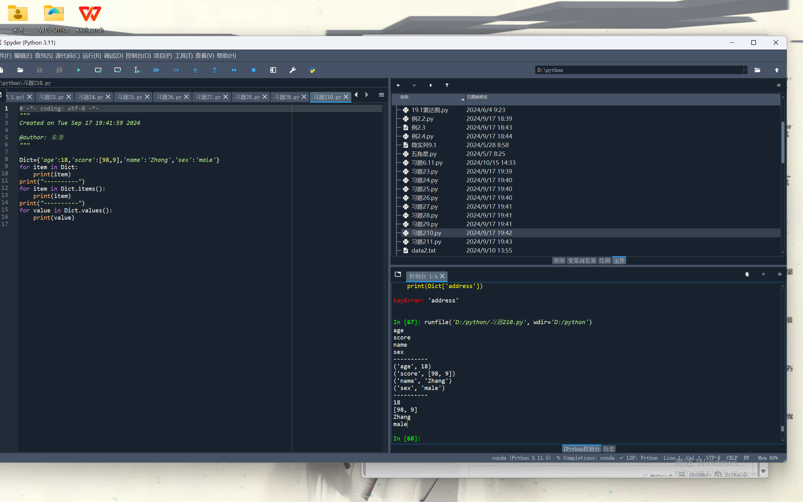 Dict={'age':18,'score':[98,9],'name':'Zhang','sex':'male'} for item in Dict: print(item) print("----------") for item in Dict.items(): print(item) print("----------") for value in Dict.values(): print(value)