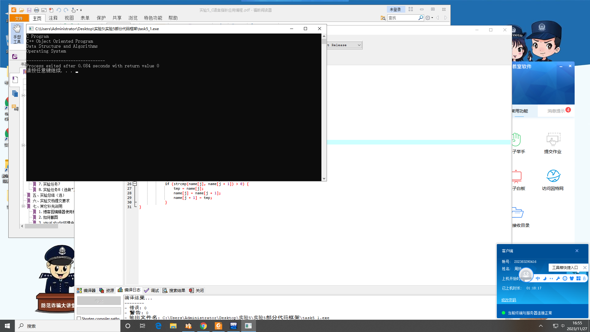 #include <stdio.h> #include <string.h> void sort(char *name[], int n); int main() { char *course[4] = {"C Program", "C++ Object Oriented Program", "Operating System", "Data Structure and Algorithms"}; int i; sort(course, 4); for (i = 0; i < 4; i++) printf("%s\n", course[i]); return 0; } void sort(char *name[], int n) { int i, j; char *tmp; for (i = 0; i < n - 1; ++i) for (j = 0; j < n - 1 - i; ++j) if (strcmp(name[j], name[j + 1]) > 0) { tmp = name[j]; name[j] = name[j + 1]; name[j + 1] = tmp; } }