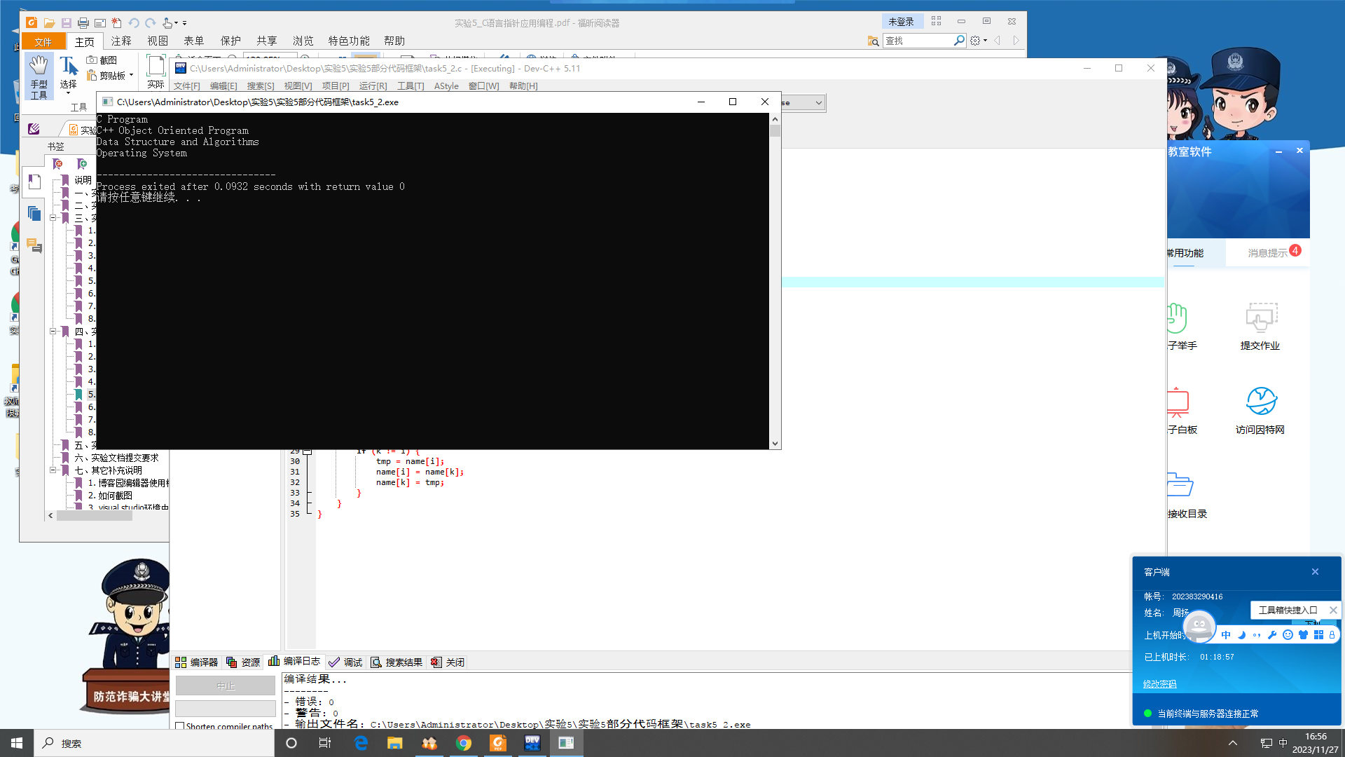 #include <stdio.h> #include <string.h> void sort(char *name[], int n); int main() { char *course[4] = {"C Program", "C++ Object Oriented Program", "Operating System", "Data Structure and Algorithms"}; int i; sort(course, 4); for (i = 0; i < 4; i++) printf("%s\n", course[i]); return 0; } void sort(char *name[], int n) { int i, j, k; char *tmp; for (i = 0; i < n - 1; i++) { k = i; for (j = i + 1; j < n; j++) if (strcmp(name[j], name[k]) < 0) k = j; if (k != i) { tmp = name[i]; name[i] = name[k]; name[k] = tmp; } } }