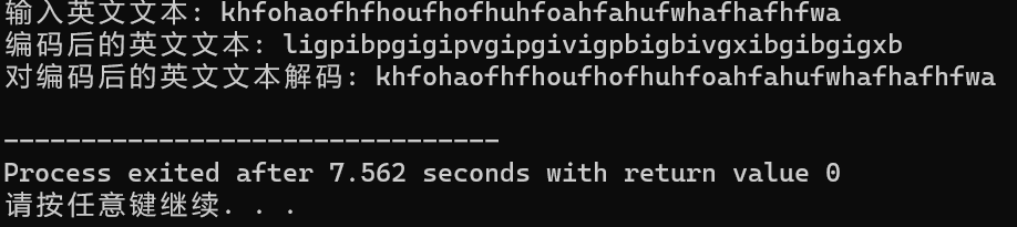 #include <stdio.h> #define N 80 void encoder(char *str); // 函数声明 void decoder(char *str); // 函数声明 int main() { char words[N]; printf("输入英文文本: "); gets(words); printf("编码后的英文文本: "); encoder(words); // 函数调用 printf("%s\n", words); printf("对编码后的英文文本解码: "); decoder(words); // 函数调用 printf("%s\n", words); return 0; } void encoder(char *str) { while(*str != '\0'){ if(*str >= 'A'&&*str<'Z'||*str>= 'a'&&*str<'z') (*str)++; else if(*str == 'z') *str = 'a'; else if(*str == 'Z') *str = 'A'; str++; } } void decoder(char *str) { while(*str!='\0'){ if(*str > 'A'&&*str<='Z'||*str> 'a'&&*str<='z') (*str)--; else if(*str == 'a') *str = 'z'; else if(*str == 'A') *str = 'Z'; str++; } }