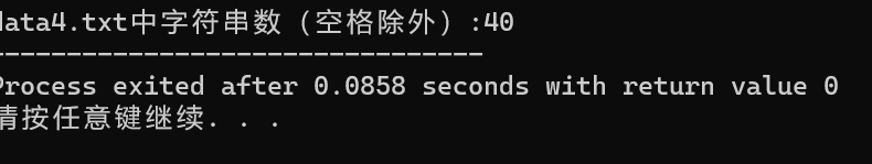 #include <stdio.h> int main() { int i=0; char s; FILE *fp; fp=fopen("data4.txt","r"); while(1){ s=fgetc(fp); if(s==EOF){ break; } else if(s==' '||s=='\n'){ i--; } i++; } printf("data4.txt中字符串数(空格除外):%d",i); fclose(fp); return 0; }