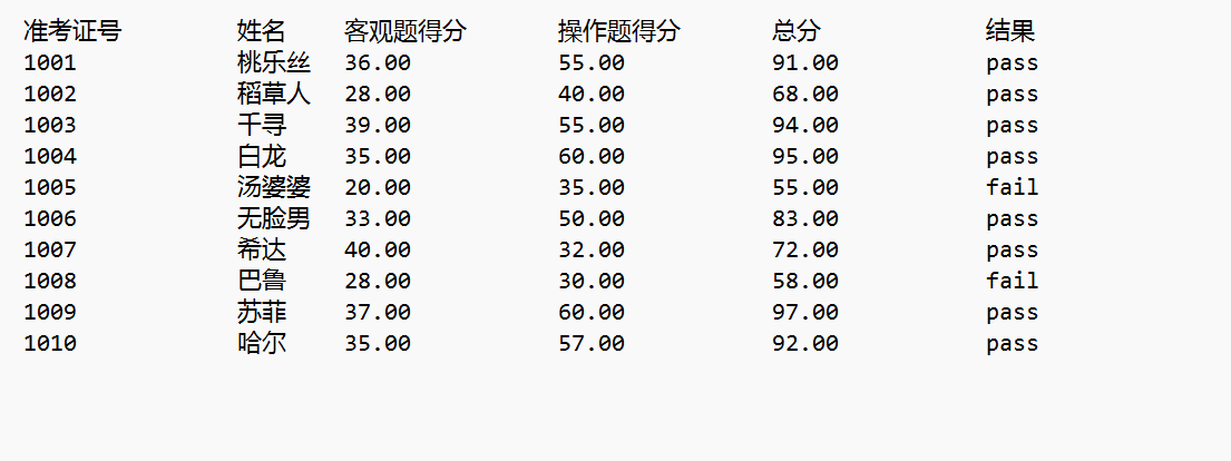 #include <stdio.h> #include <string.h> #include <stdlib.h> #define N 10 typedef struct { long int id; char name[20]; float objective; // 客观题得分 float subjective; // 操作题得分 float sum; // 总分 char ans[10]; // 考试结果 } STU; // 函数声明 void finput(STU st[], int n); void foutput(STU st[], int n); void output(STU st[], int n); int process(STU st[], int n, STU st_pass[]); int main() { STU stu[N], stu_pass[N]; int cnt; double pass_rate; printf("从文件读入%d个考生信息...\n", N); finput(stu, N); printf("\n对考生成绩进行统计...\n"); cnt = process(stu, N, stu_pass); printf("\n通过考试的名单:\n"); output(stu, N); // 输出到屏幕 foutput(stu, N); // 输出到文件 pass_rate = 1.0 * cnt / N; printf("\n本次等级考试通过率: %.2f%%\n", pass_rate*100); return 0; } // 把通过考试的考生完整信息输出到屏幕上 // 准考证号,姓名,客观题得分,操作题得分,总分,结果 void output(STU st[], int n) { int i; printf("准考证号\t姓名\t客观题得分\t操作题得分\t总分\t\t结果\n"); for (i = 0; i < n; i++) printf("%ld\t\t%s\t%.2f\t\t%.2f\t\t%.2f\t\t%s\n", st[i].id, st[i].name, st[i].objective, st[i].subjective, st[i].sum, st[i].ans); } // 从文本文件examinee.txt读入考生信息:准考证号,姓名,客观题得分,操作题得分 void finput(STU st[], int n) { int i; FILE *fin; fin = fopen("examinee.txt", "r"); if (fin == NULL) { printf("fail to open file\n"); exit(0); } while (!feof(fin)) { for (i = 0; i < n; i++) fscanf(fin, "%ld %s %f %f", &st[i].id, st[i].name, &st[i].objective, &st[i].subjective); } fclose(fin); } // 把通过考试的考生完整信息写入文件list_pass.txt // 准考证号,姓名,客观题得分,操作题得分,总分,结果 void foutput(STU s[], int n) { FILE *fout; int i; // 保存到文件 fout = fopen("list_pass.txt", "w"); if (!fout) { printf("fail to open or create list_pass.txt\n"); exit(0); } fprintf(fout, "准考证号\t\t姓名\t客观题得分\t操作题得分\t总分\t\t结果\n"); for (i = 0; i < n; i++) fprintf(fout, "%ld\t\t%s\t%.2f\t\t%.2f\t\t%.2f\t\t%s\n", s[i].id, s[i].name, s[i].objective, s[i].subjective, s[i].sum, s[i].ans); fclose(fout); } // 对考生信息进行处理:计算每位考生考试总分、结果;统计考试通过的人数 int process(STU st[], int n, STU st_pass[]) { // 待补足 // ××× int i,j,a=0; for(i=0;i<n;i++){ st[i].sum=st[i].objective+st[i].subjective; if(st[i].sum>=60){ strcpy(st[i].ans, "pass"); st_pass[a++]=st[i]; } else{ strcpy(st[i].ans, "fail"); } } return a; }
