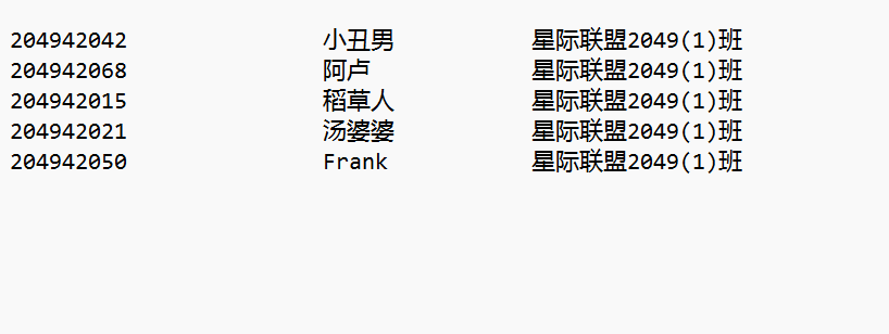 #include <stdio.h> #include <string.h> #include <stdlib.h> #define N 80 #define M 5 typedef struct { long int id; char name[20]; char cla[40]; } STU; void finput(STU st[], int n); void foutput(STU st[], int n); void output(STU st[], int n); int main(){ STU stu[N],stu_chose[M]; int i,j,a; finput(stu, N); for(i=0;i<5;i++){ a=rand()%80; stu_chose[i]=stu[a]; } output(stu_chose, M); // 输出到屏幕 foutput(stu_chose, M); // 输出到文件 return 0; } void finput(STU st[], int n) { int i; FILE *fin; fin = fopen("list.txt", "r"); if (fin == NULL) { printf("fail to open file\n"); exit(0); } while (!feof(fin)) { for (i = 0; i < n; i++) fscanf(fin, "%ld %s %s", &st[i].id, st[i].name, st[i].cla); } fclose(fin); } void output(STU st[], int n) { int i; for (i = 0; i < n; i++) printf("%ld\t\t%s\t\t%s\n", st[i].id, st[i].name, st[i].cla); } void foutput(STU s[], int n) { FILE *fout; int i; // 保存到文件 fout = fopen("lucky.txt", "w"); if (!fout) { printf("fail to open or create lucky.txt\n"); exit(0); } for (i = 0; i < n; i++) fprintf(fout, "%ld\t\t%s\t\t%s\n", s[i].id, s[i].name, s[i].cla); fclose(fout); }