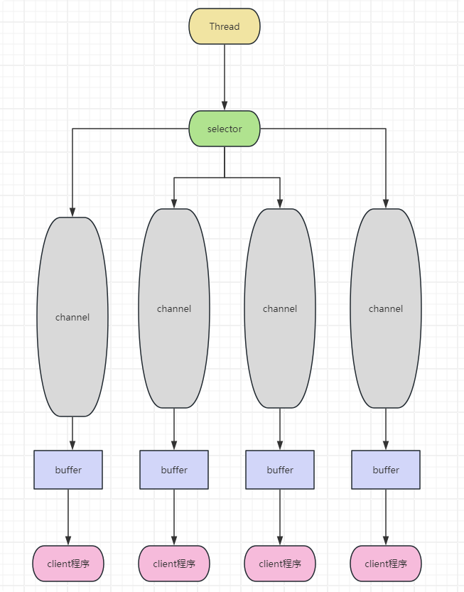 Selector 对应一个线程,一个线程对应多个 channel ,下图反应了有四个channel注册到该selector。Selector 会根据不同的事件,在各个 channel 通道上切换,切换到哪个channel是由事件决定的。