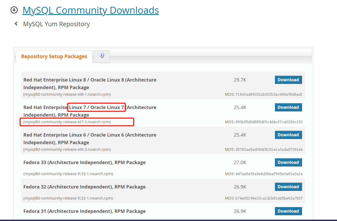 mysql官方地址:https://dev.mysql.com/downloads/repo/yum/