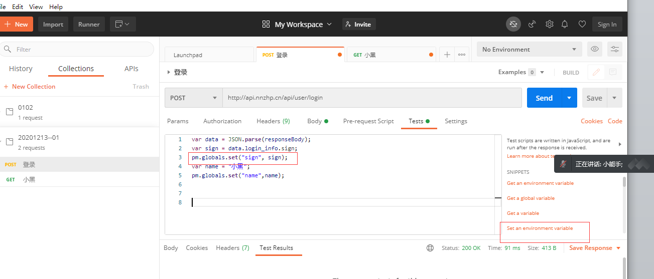 pm.globals.set("sign", sign); // 定义一个全局变量,命名为 sign ,值是前面取出来的login_info字段下的sign字段的数据