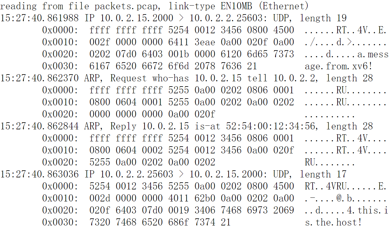 您的输出结果看起来会有些不同,但应该包含字符串 "ARP、请求"、"ARP、回复"、"UDP"、"a.message.from.xv6 "和 "this.is.the.host"。