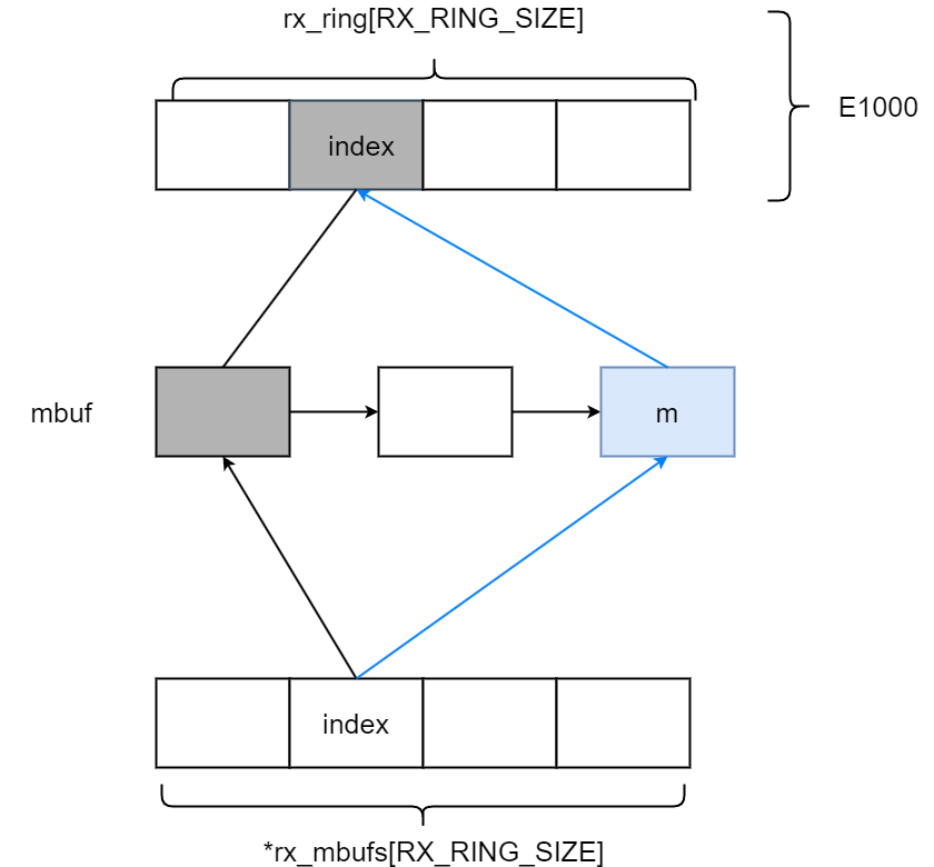 rx_mbufs[index] = m; // replace the one just given to net_rx()