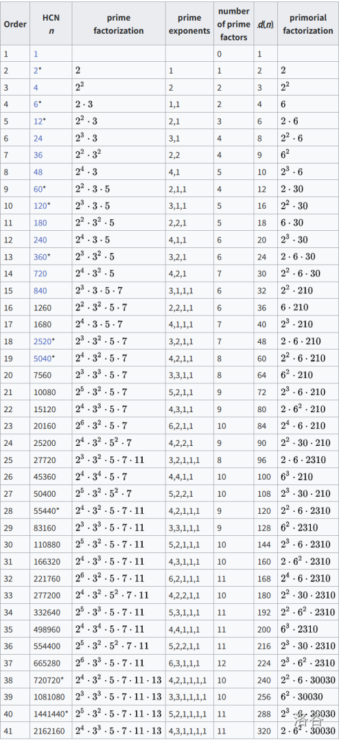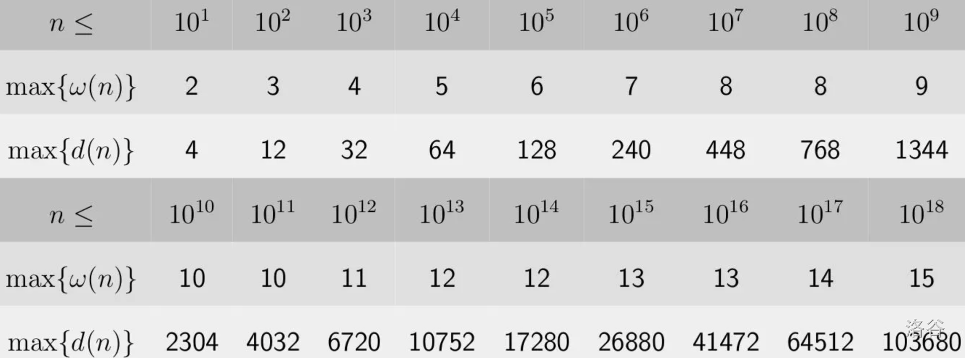 还有些时候我们的复杂度可能与 \(\max_{i = 1}^{n} d(i)\) 有关,但我们无法向 \(\omega(n)\) 一样,得出一个对 \(d(n)\) 的不错的估计。因此邪恶的出题人可能会故意去一个 \(d(n)\) 很大的 \(n\) 来卡我们,而这样的 \(n\) 有一个专业的名称:高合成数。