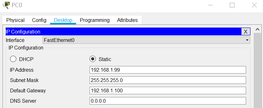 192.168.1.99,默认网关为192.168.1.100