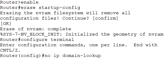 进入特权模式,清除路由器的现有配置,并且禁用DNS查找;