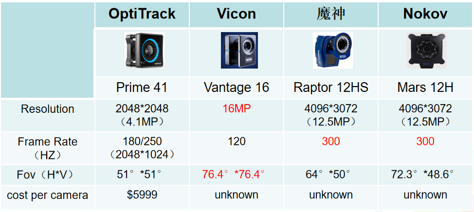 光学式解决方案比较出名的,国内:Nokov、uSens、青瞳视觉,国外:美国魔神(Motion Analysis)、英国Vicon,美国OptiTrack。价格大概是魔神和Vicon差不多,都是最贵的,价格百万级,Nokov价格比魔神Vicon便宜点,但是顶级的硬件摄像机方面做的跟魔神和Vicon差不多,OptiTrack价格便宜点,精度不如上面三个。这四大厂家最好的摄像机配置就如下图,一般帧率越高,分辨率越高,延时越低,动作捕捉系统精度方面自然更强啊。举个例子,一般传感器的分辨率越高,从标记中获得的细节就越多,跟踪就越精准。