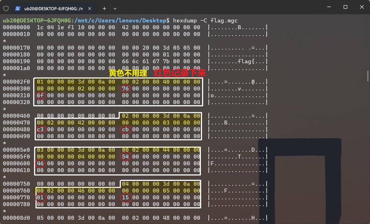 import hexdump import struct import string f = open('./flag.mgc', 'rb') b = f.read(0x178) indexes = [] table = '' while True: b = f.read(0x178) if len(b) != 0x178: break line = b[:0x30] _type = line[6] off = struct.unpack_from('<I', line, 0x0c)[0] s = f'type: {_type:02X}, off: {off:02X}' if _type == 5: s += ', str: '+line[0x20:].decode() elif _type == 1: n1, n2 = line[0x18], line[0x20] v = n1 ^ n2 s += f', byte: {n1:02X} {n2:02X} {v:02X} {chr(v)}' table += chr(v) elif _type == 10: n1, n2 = line[0x18], line[0x20] v = n1 ^ n2 s += f', leshort: {n1:02X} {n2:02X} {v:02X} {v}' indexes.append(v) print(s) # hexdump.hexdump(line) # print('') # f_o_a__lhy_s_y^^hete_ug___goo_t_ print(table) # [25, 8, 18, 20, 27, 31, 30, 26, 7, 13, 5, 11, 16, 9, 34, 32, 22, 10, 19, 23, 24, 15, 28, 36, 12, 33, 17, 6, 14, 35, 21, 29] print(indexes) real_flag = [' ']*40 for i in range(len(indexes)): print(indexes[i], table[i]) real_flag[indexes[i]] = table[i] print(''.join(real_flag)) # _oh_yes_you_got_the_flag___^_^__