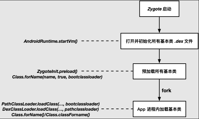 在 ZygoteInit.preloadClasses() 方法中,通过指定 BootClassLoader 作为类加载器来使用 Class.forName() 加载基本类,该方法触发类初始化,此后应用程序就可以通过 Class.forName()来加载这些已经预加载的基本类。