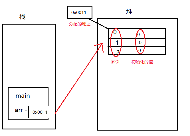 在内存中是怎么被定义的:主函数先进栈,在栈中定义一个变量arr;接下来为arr赋值,但是右边不是一个具体值,而是一个实体。实体创建在堆里,在堆里首先通过关键字新开辟一个空间,内存在存储数据的时候都是通过地址来体现的,地址是一块连续的二进制,然后给这个实体分配一个内存地址。数组都是有一个索引,数组这个实体在堆内存中产生之后每一个空间都会进行默认的初始化(这是堆内存的特点,未初始化的数据是不能用的,但在堆里是可以用的,因为初始化过了,但是在栈里没有),不同的类型初始化的值不一样。所以堆和栈里就创建了变量和实体: