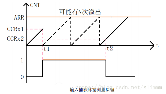 高电平期间t2-t1=N*ARR+CRRx2(需获取N和CRRx2值),在检测到下次上升沿,就能获取整个脉冲周期和占空比;