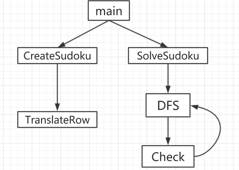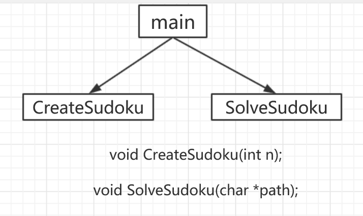 概要设计在这道题中主要是划分模块。我们上期讲到两个子任务,生成终局和求解数独,生成数独命令行传入sudoku.exe -c n,求解数独命令行传入sudoku.exe -s path,因此在主函数需要根据传入的第二个参数是"-c"还是"-s"选择调用对应的模块,这里的模块可以理解为源文件.cpp. 出于模块划分的高内聚低耦合的要求,应该尽量减少模块间的数据传递、禁止数据共享,这两个子任务肯定是分模块处理,很容易想到传递的参数是n和path,而不是不传参数导致共享数据、或者传递过多参数不利于信息隐藏,至于具体的操作就在模块中封闭处理。 在此给出概要设计阶段的函数调用图: