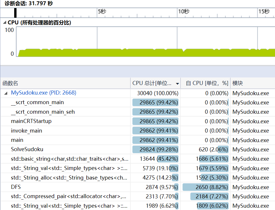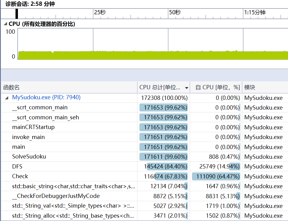 根据详细设计中的思路比较轻松地完成编码后,接下来进行初步验证。首先是要有残局文件作为输入,但是目前还尚未构建残局,所以取了两个极端例子进行性能检测:1e6个全为0的数组(全需填充)和上一节生成的1e6个不需填充的终局。理论上应该是空格越多,耗时越长,因为没有碰壁可以搜得更深。