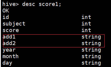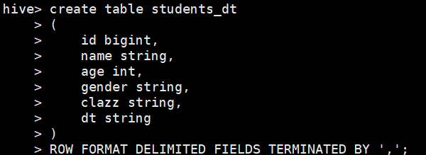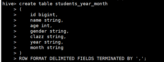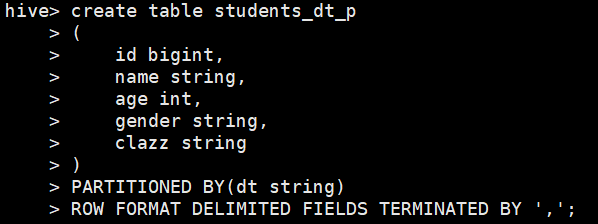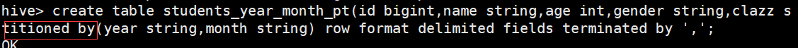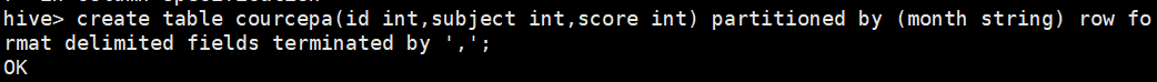 create table score(id int,subject int,score int) partitioned by (year string,month string,day string) row format delimited fields terminated by ',';