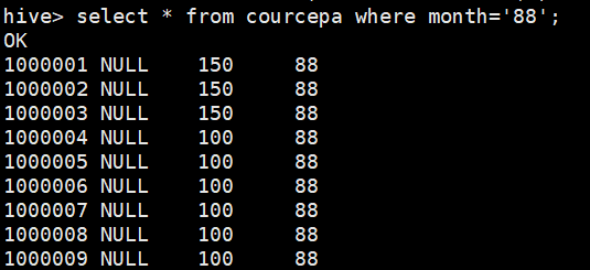 hive建外部表(可以保留数据):hive> create external table courcepa1 (id int,subject string,score int) partitioned by (month string) row format delimited fields terminated by ',' location '/datacource';