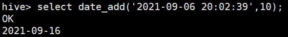 hive> select date_add('2021-09-06 20:02:39',10);